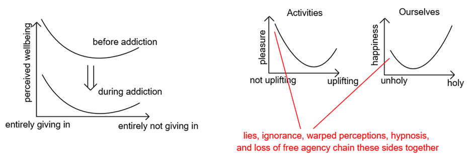 As one can see – though addictive activities might initially increase pleasure, in the long run they decrease pleasure. But people remain bound to the addiction because to give up the addiction temporarily grants even less pleasure. It is tempting to believe that going halfway to an addiction is the best of both worlds, however, it is the worst of both worlds – it leaves increased addictive urges, and therefore leaves you feeling even more unsatisfied. On the right diagram, I believe many are deceived by noting that further giving in grants greater pleasure. However, this is myopic because overall, happiness from everything else decreases, thus overall decreasing wellbeing.