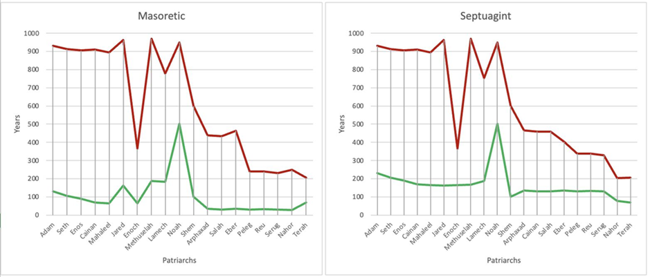 According to the Septuagint, Adam was created around 5554 BC, while in the Masoretic Text, Adam was created in 4,004 BC (source – though some people have slightly numbers, such as here). This graph shows how the dating differs – the red line represents total lifespan, while the green is the age at begettal for the next generation (source):