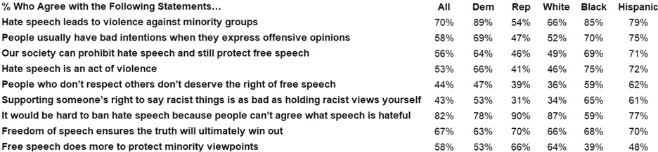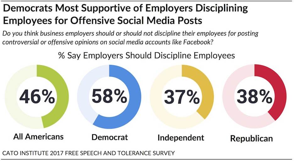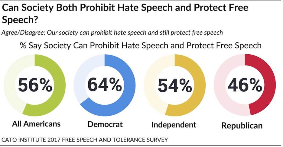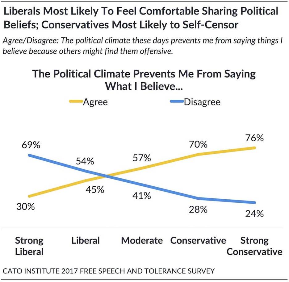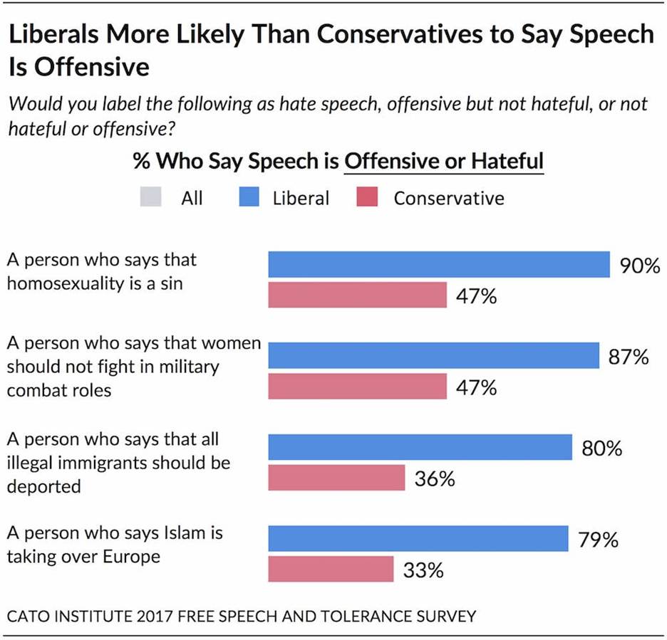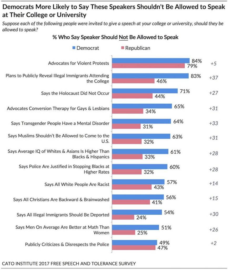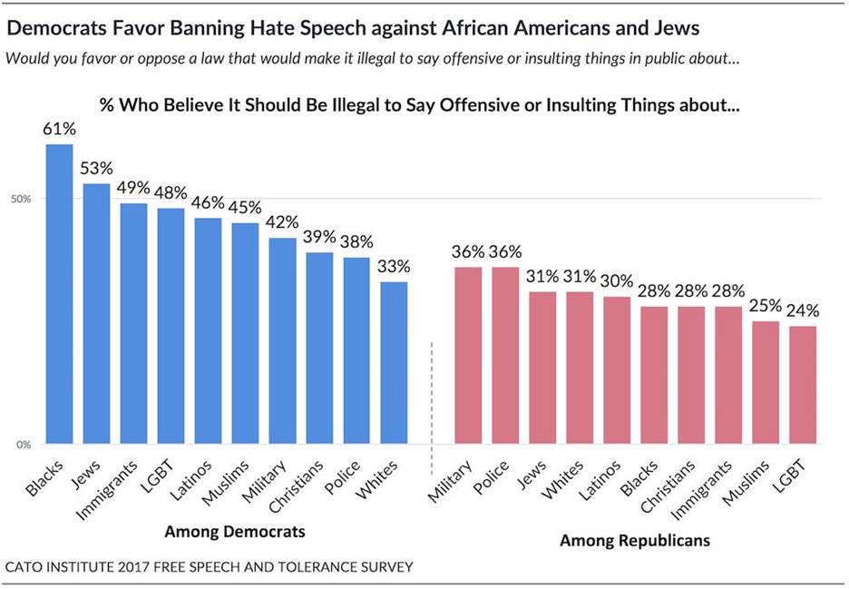 Along the same lines, democrats also have this weird obsession with banning free speech. This sort of is personal for me because I have been censured, banned, and shadow banned by a lot of social media companies, and I think I am on a list of people where AI automatically shadow bans anything I say if it is political. This article from CATO provides some pretty good statistics about the bias of leftists towards banning free speech. (need I explain how extremely absurd it is to claim that free speech can still exist if “hate speech” is banned?)