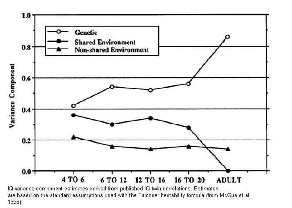 The fact that increasing welfare doesn’t end the cycle of poverty should have been obvious from the beginning because: Lifetime earnings are about 50% heritable, with shared environment being negligible. Thus, the only reason why children tend to have high incomes if their parents have high incomes is because of genetics, and excluding the influence of genetics, the type of home you are raised in (on average) has no impact on income. And if you don’t believe me, researchers have furthermore proved that the income of adopted children matches that of biological parents and has no resemblance to adopted parents. So just to emphasize: the idea that if a child’s family is poor he will also grow up to be poor because he is lacking in opportunities is completely false. If this was true, then the shared environment of children in twin studies would actually have an effect on children’s income, except it doesn’t. Here is just one more statistic on that: